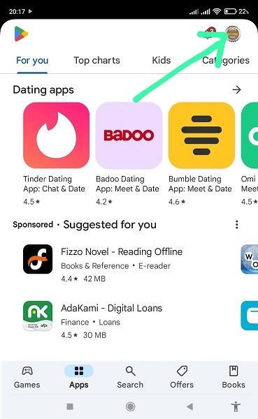 2. Setelah halaman Play Store terbuka, klik logo email ( google account ) yang terdapat pada pojok kanan atas (perhatikan gambar diatas) .