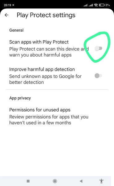 1. Perhatikan pada halaman Play Protect Setting ada 2 (dua) pilihan On/Off, silahkan geser ke mode OFF untuk pilihan bagian atas ( lihat lingkaran hijau pada gambar diatas).